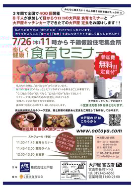 7/26(木)11:00より、重茂千鶏仮設住宅広場にて、大戸屋『出前』食育セミナーを開催します。